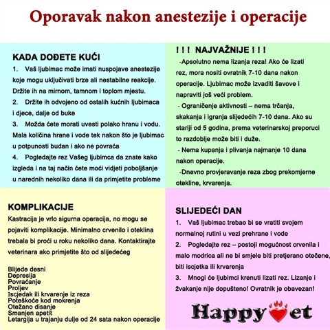 Nakon operacije – koliko dugo će Vaš ljubimac ostati kod njih, ovisi o vrsti postupka. Imajte na umu da je razdoblje nakon operacije, kada se javlja najviše komplikacija, u tom vremenu važno slijediti preporuke Vašeg veterinara za rehabilitaciju i oporavak. U nekim slučajevima, to može značiti razliku između života i smrti za Vašeg ljubimca.