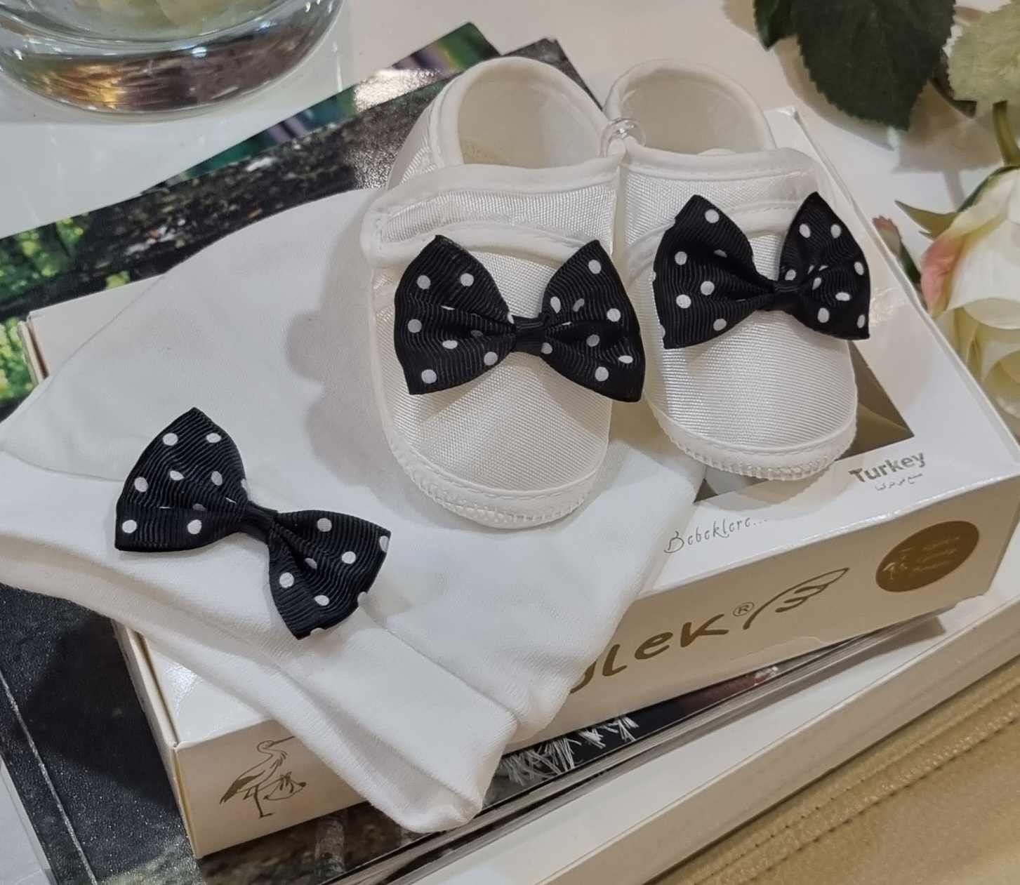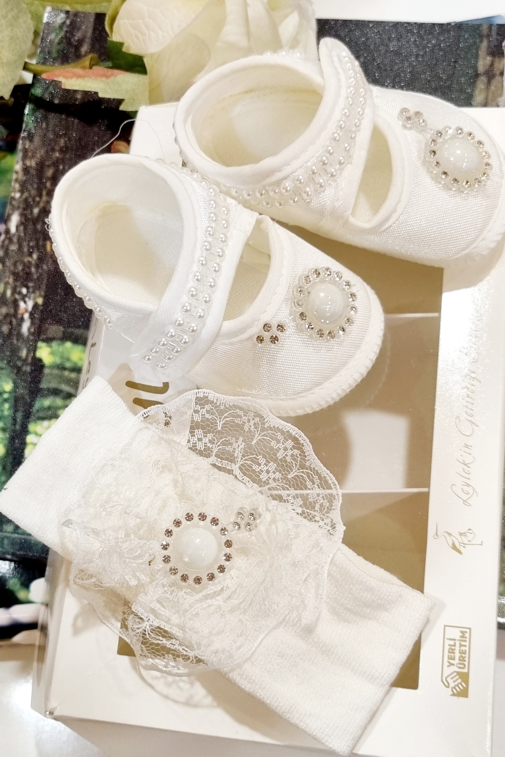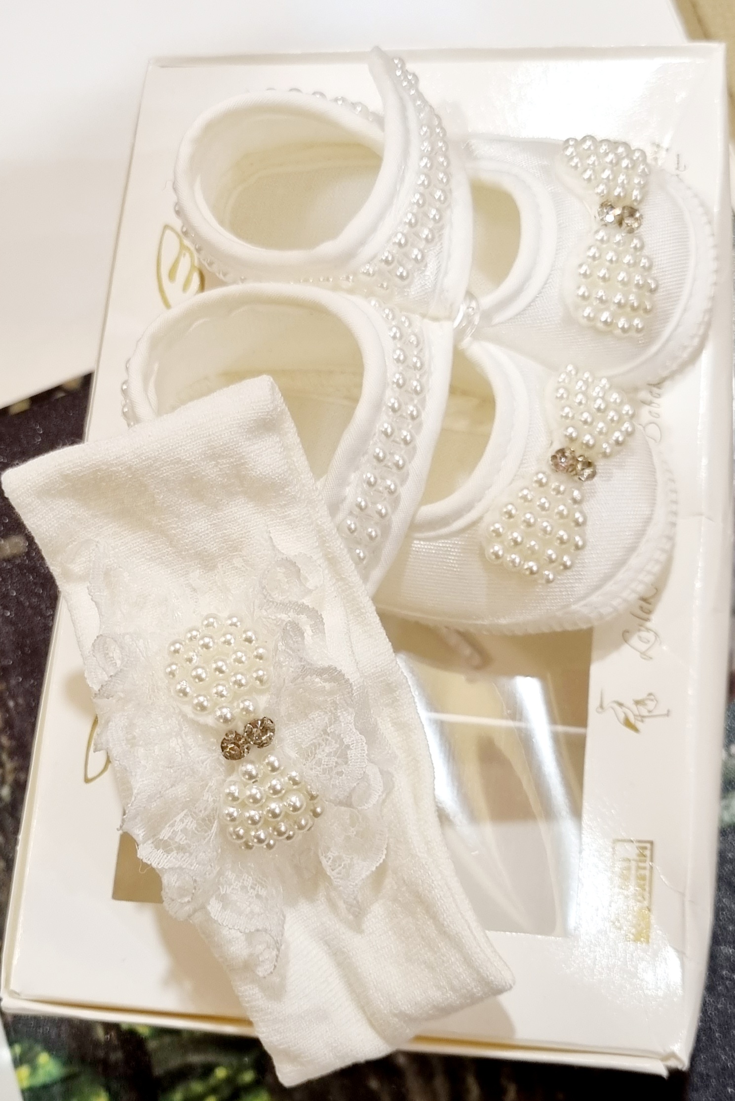 Cipelice za krstitke sa biserima su nehodajuće cipelice. U kompletu dolaze sa trakicom za kosu koja je ukrašena tilom i biserima.